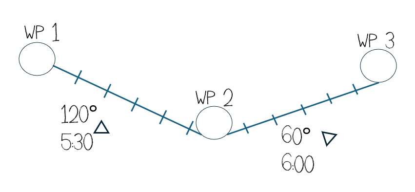 Keep leg lengths between 5-10 nm to minimize accumulation of errors. Mark magnetic heading and time to next waypoint next to the leg line. Place minute marks on the flight legs. Round time to the next ten seconds, e.g. 5:32 min to 5:30.