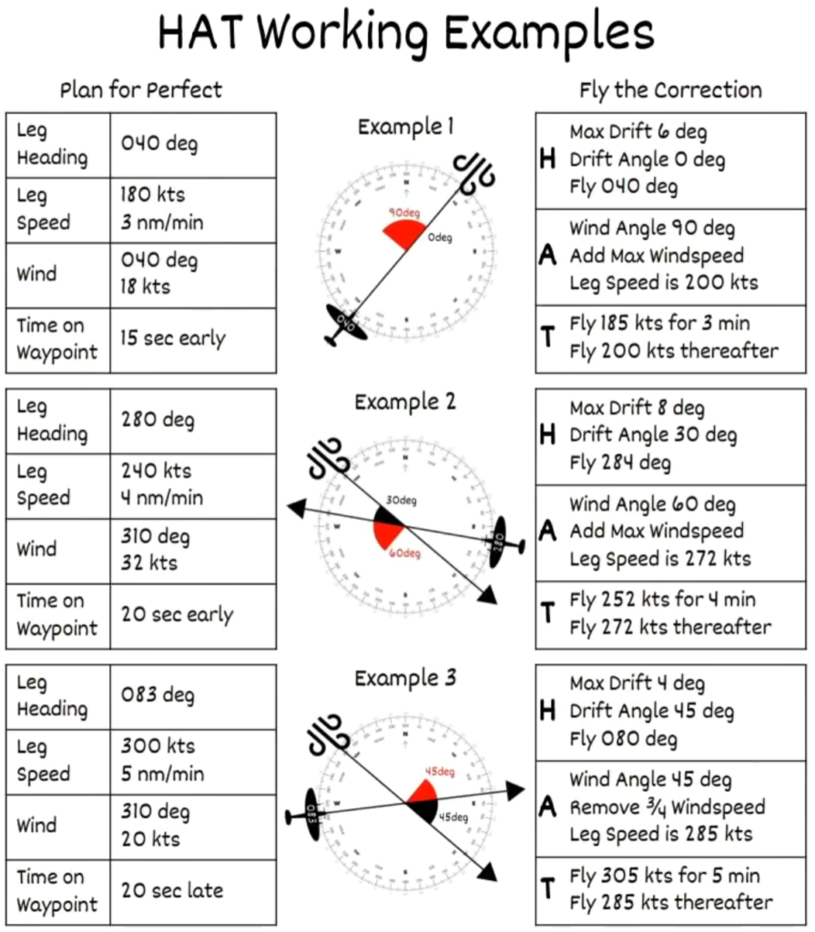Headings: In flight planning in the briefing room on the maps (aeronautical charts) the headings are measured in true headings and then converted to magnetic headings before the flight. During the flight all headings are magnetic headings to avoid confusion and mistakes. Use only integer numbers, not decimals, e.g. 4° instead of 3.7°. All headings are planned for still air (no wind) and corrected for wind drift during flight (see HAT Check below). This has main advantages over planning it with wind correction baked in from the start: 1. the mission can be pre-planned weeks before and the most current wind and weather information can be used ad-hoc just before the flight, 2. any wind change or update can be incorporated ad-hoc during the mission as well.