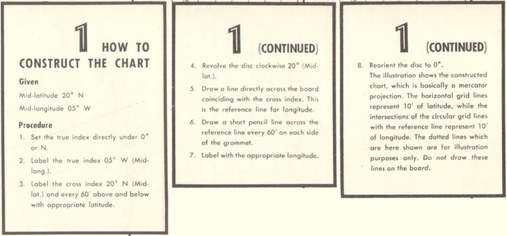 If you follow these eight steps using the plotting board, you get the plot shown below, which is basically just a coordinate system in which to plot the geographical coordinates used in a flight mission. By turning the disc clockwise (north hemisphere) or counter-clockwise (south hemisphere) - step 4 of the instructions - you adjust the plot for latitude angles; in this example flying in a region around 20° N latitude.